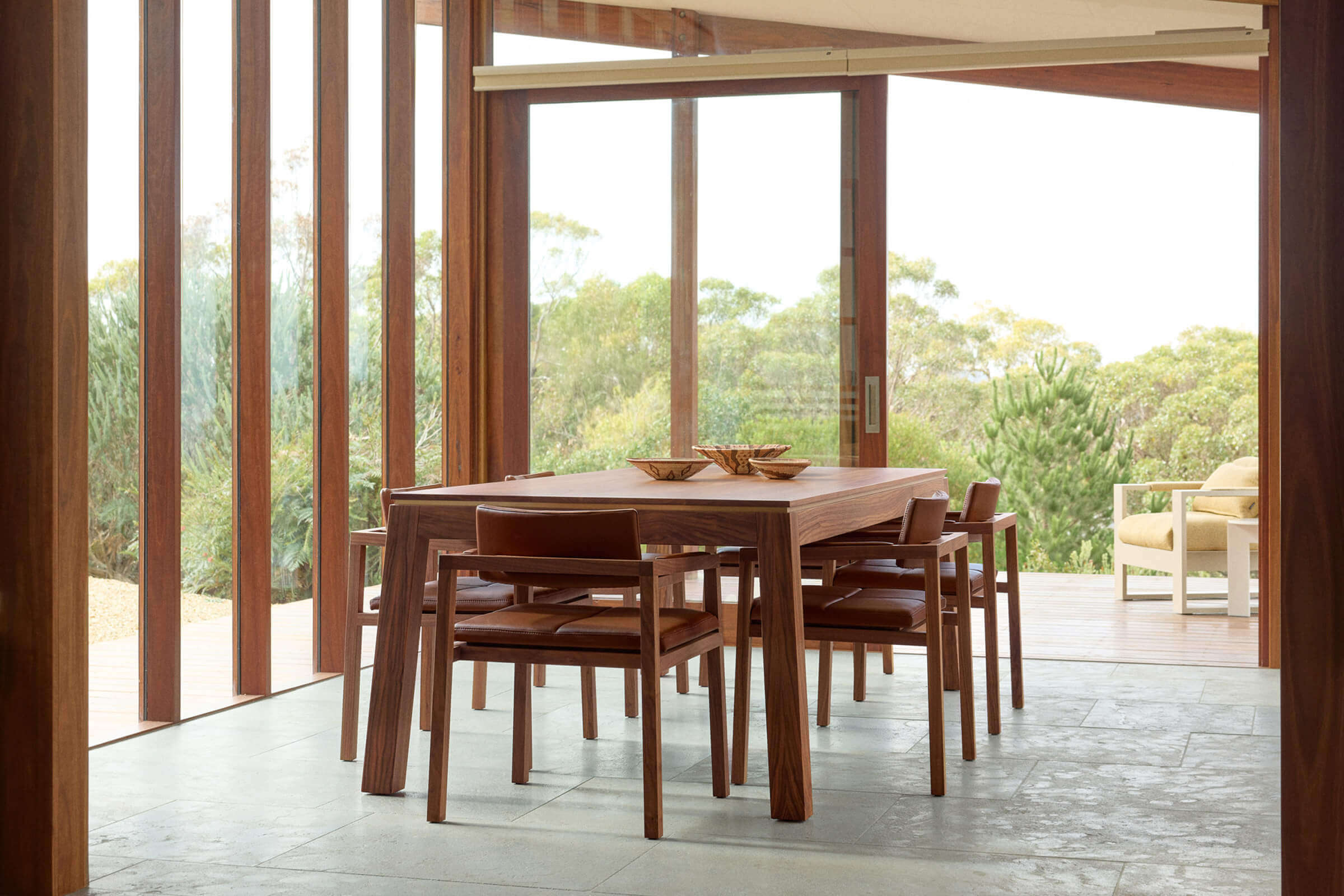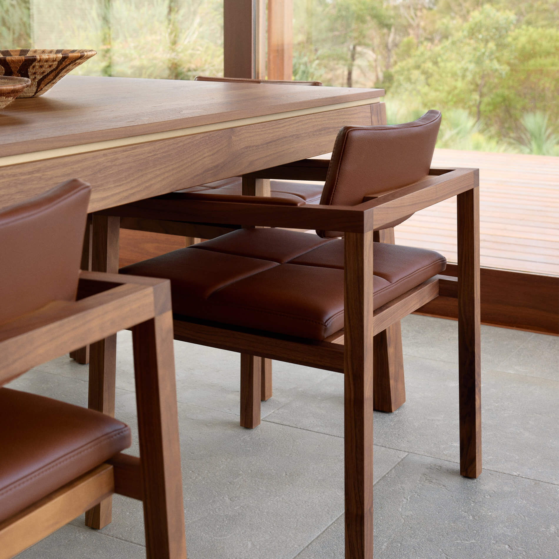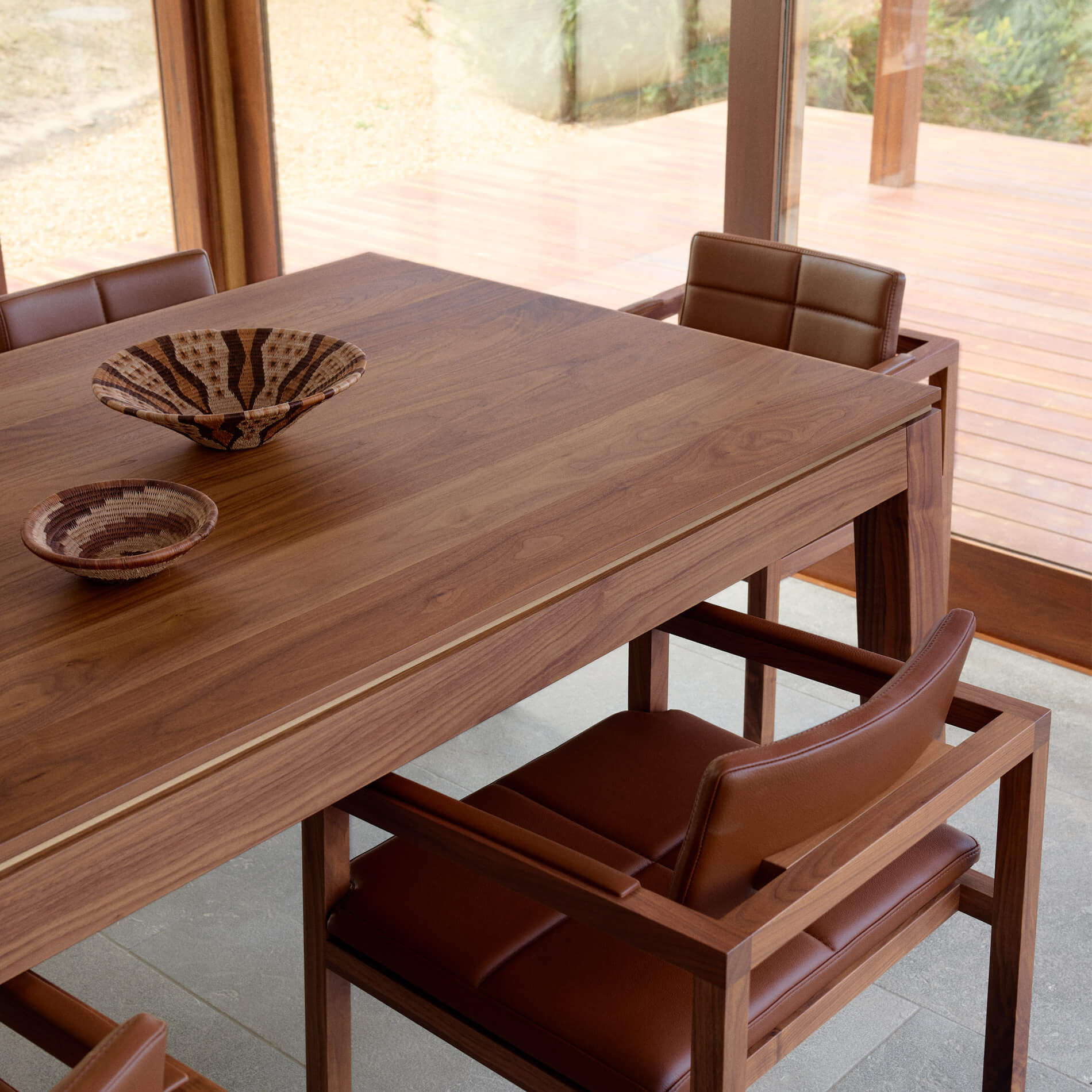 The solid American walnut timber dining setting anchors the open space with quiet confidence. The solid brass table shadow-line adds a subtle detail, and the premium leather upholstered dining chairs add warmth to the rammed earth walls and solid stone floors.