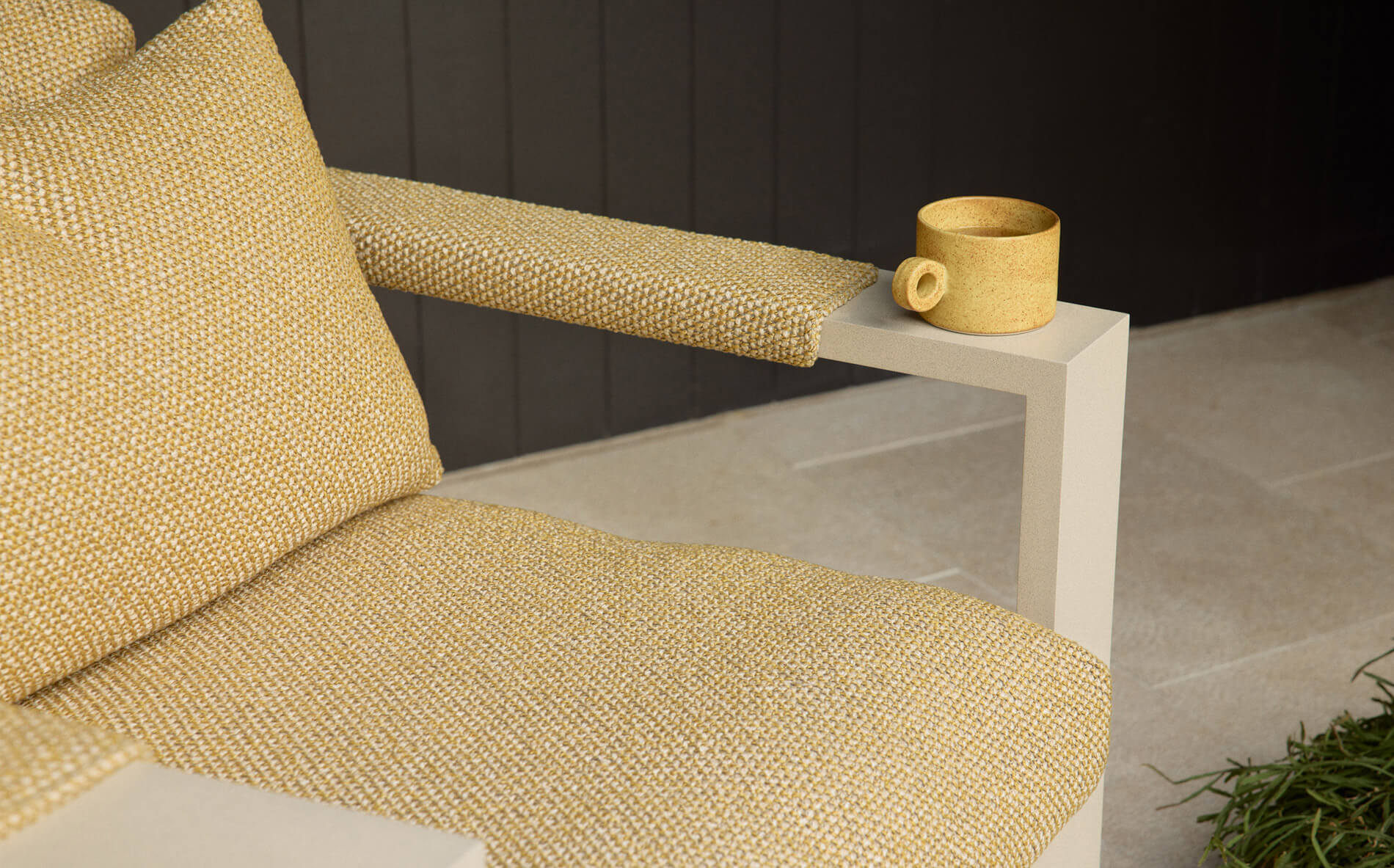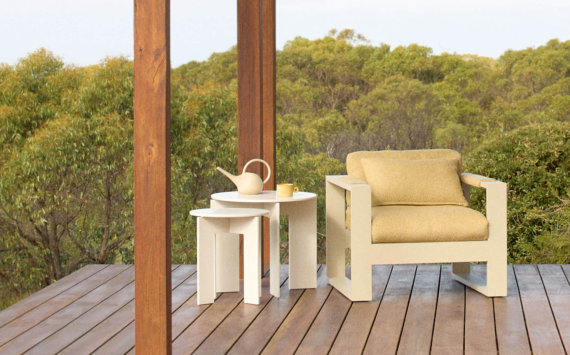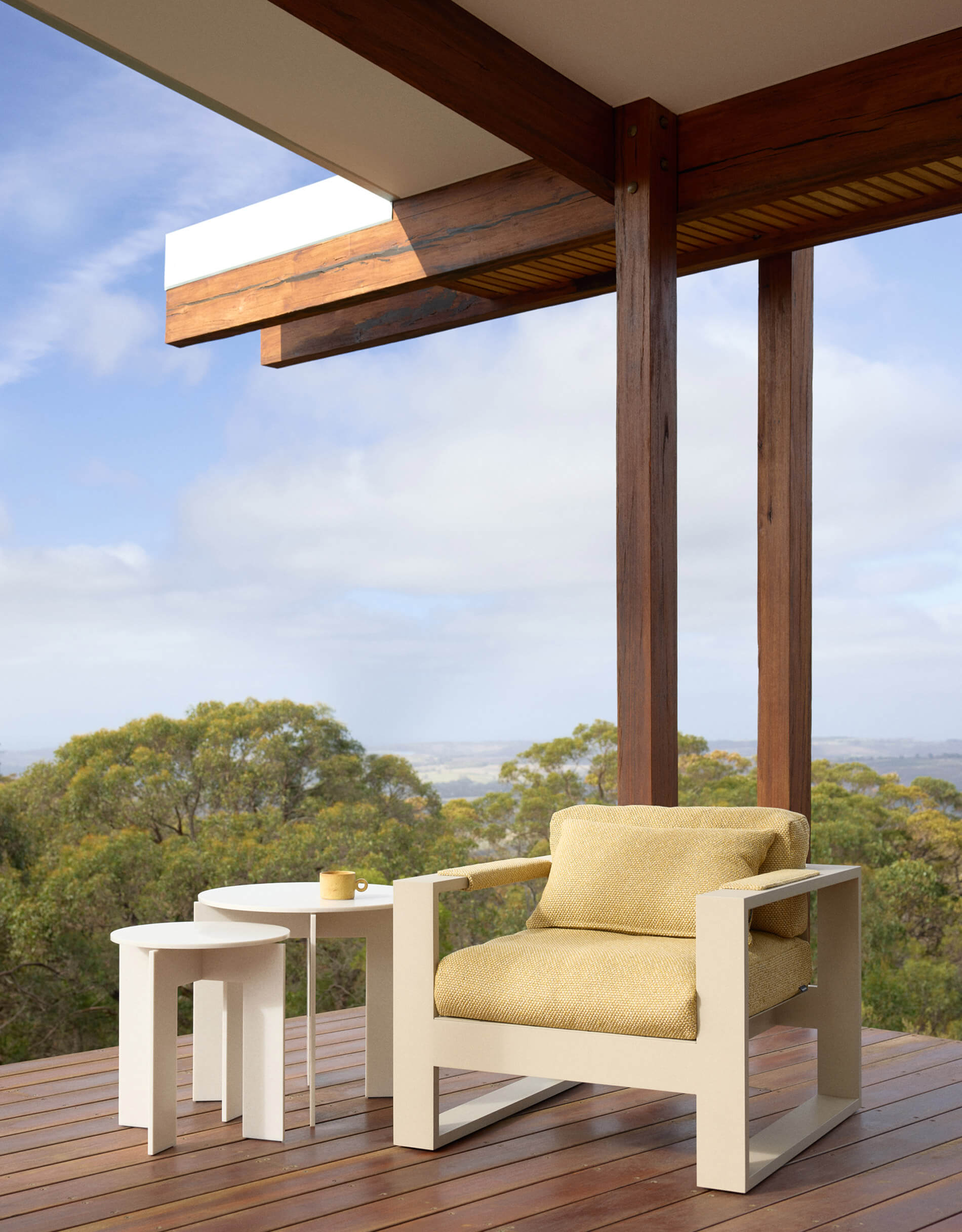 Nearby, the outdoor Piana side tables, sleek and purposeful, serve as quiet companions to slow mornings and sunset reflections. Together, they frame the landscape rather than compete with it. Capturing the Australian light in its purest form.