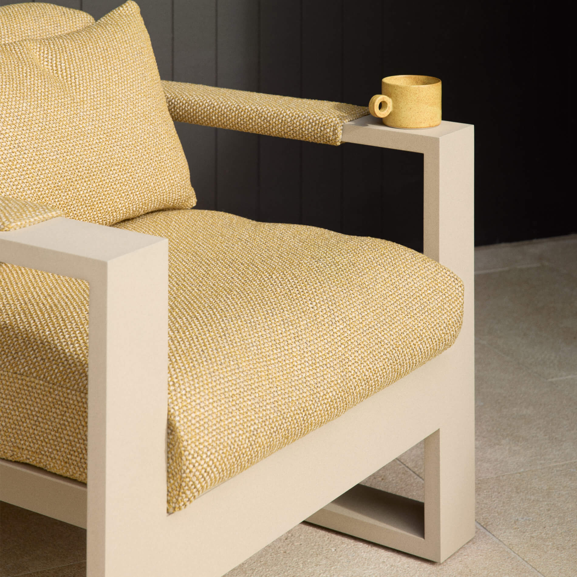 Our Vista outdoor sofa and armchair created an inviting sanctuary for long, effortless hours of lounging. Crafted with a robust textured powdercoat and Italian woven outdoor fabric, they bring both enduring durability and an effortless sense of refined beauty to the home’s outdoor space.