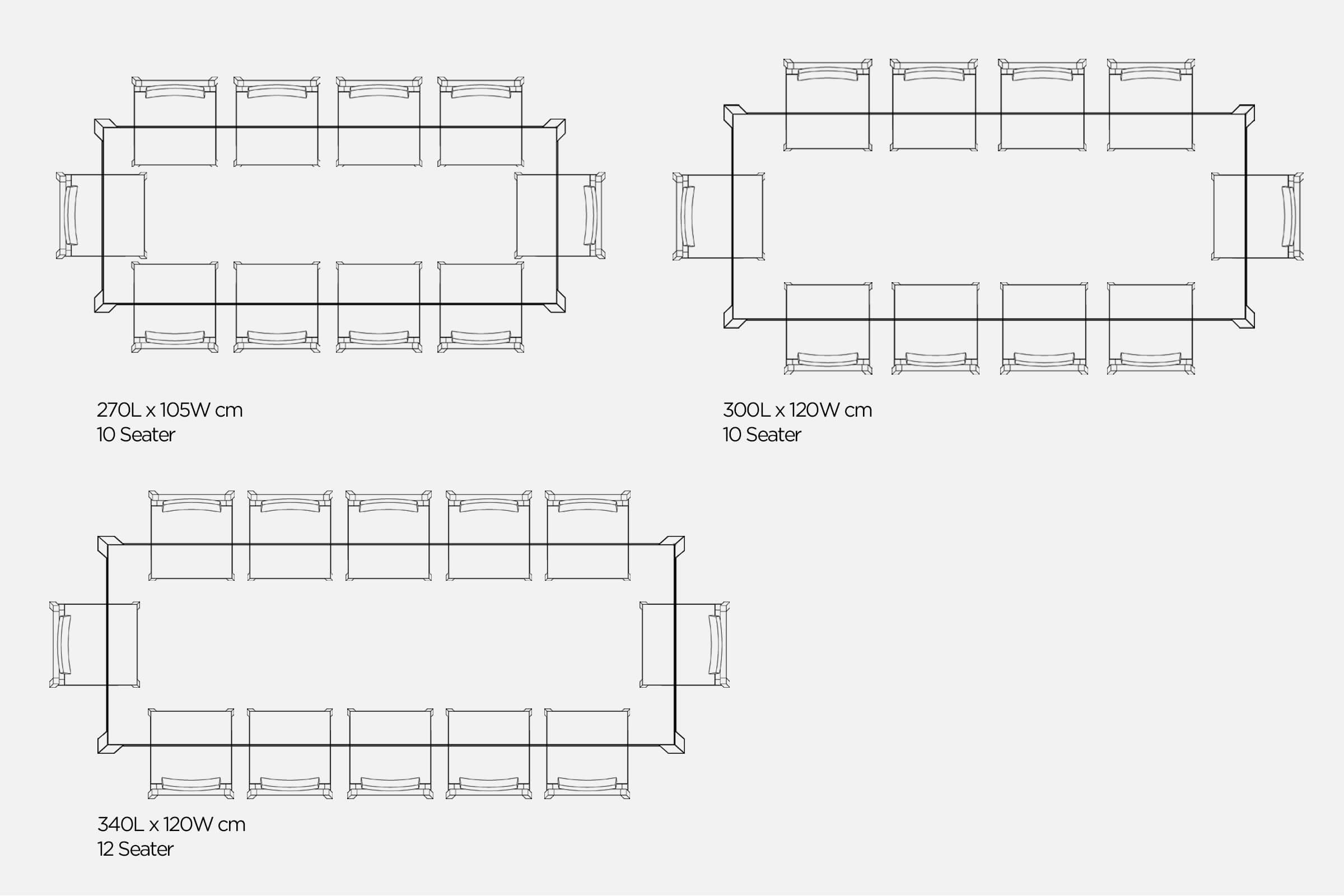 Our table size guide here is an effortless starting point for all designer table selections. Further down, we have included two options, one showing a chair with arms, and the other a chair without arms depending on your preference.